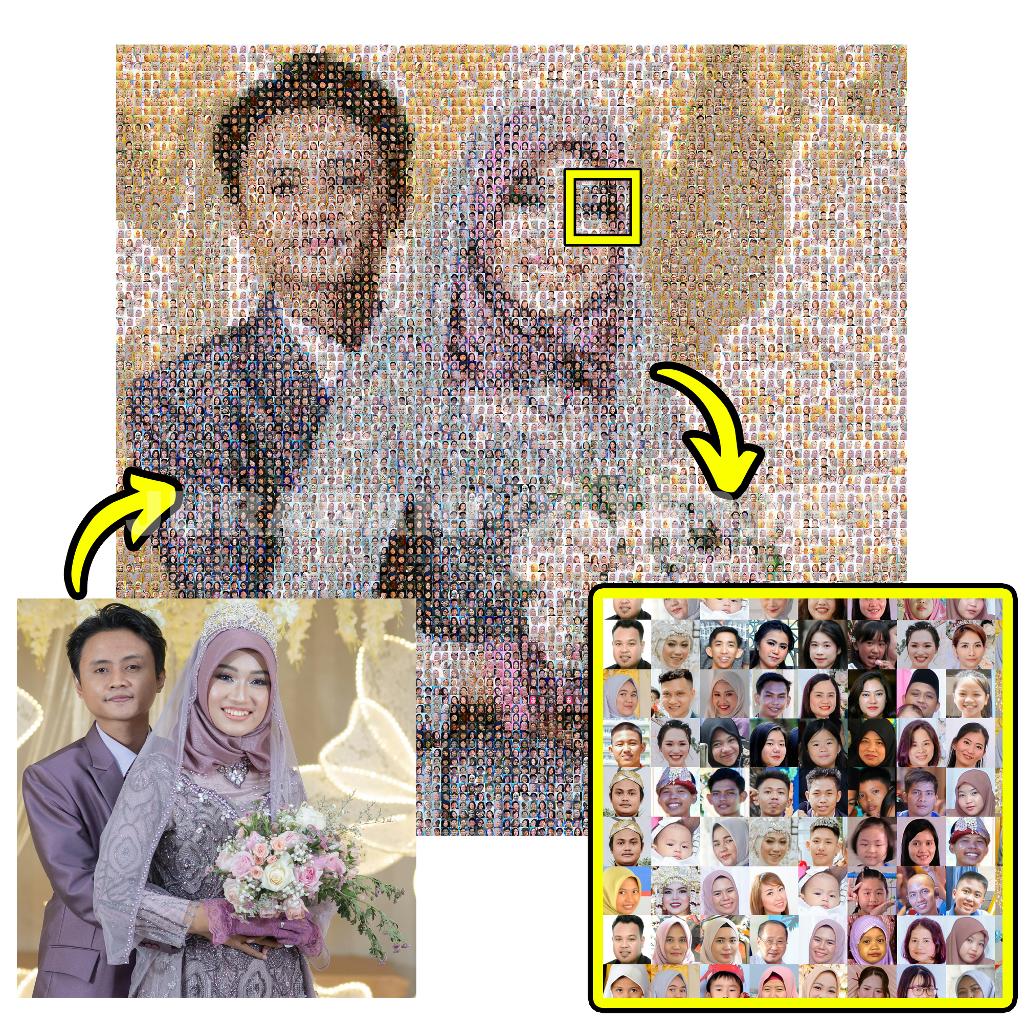 True Mosaic (Layanan Kami): Foto utama dibentuk dari ribuan potongan foto kecil yang warna aslinya sesuai dengan kebutuhan piksel. Jika dilihat dari dekat, setiap kepingan adalah foto asli yang utuh. Nilai artistiknya sangat tinggi.